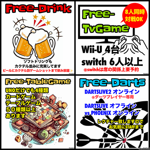 | 料金備考 | 遊び放題1000円ドリンク&フード持ち込みOK |