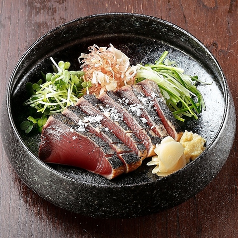 当店の鰹のタタキは市場で厳選された物を炭火で皮目を香ばしく炙り、鰹の旨味を粗塩で引き立てています。そのまま塩でも、ポン酢やにんにく、生姜などお好みの食べ方でお楽しみください