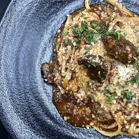 じっくり煮込んだお肉の旨味と柚子胡椒の爽やかな風味が癖になる赤ワインにあうパスタ