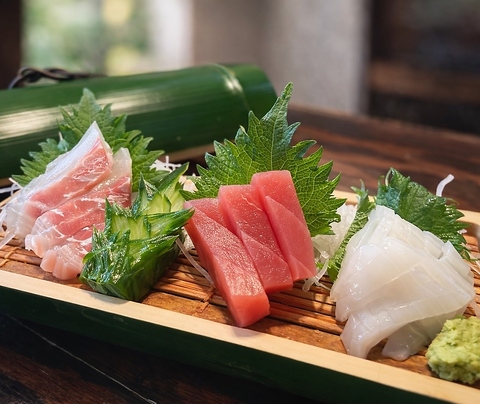 お刺身三点盛りやお刺身あぶり三種などの新鮮鮮魚、越の鶏のねぎま串など、自信をもってお勧めできる1品が多数ございます。