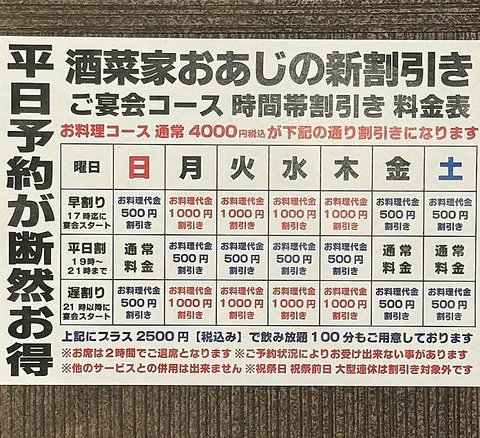 宴会コースを平日や早い時間帯の御予約で、おひとり様につき最大1000円割引とさせていただきます!!