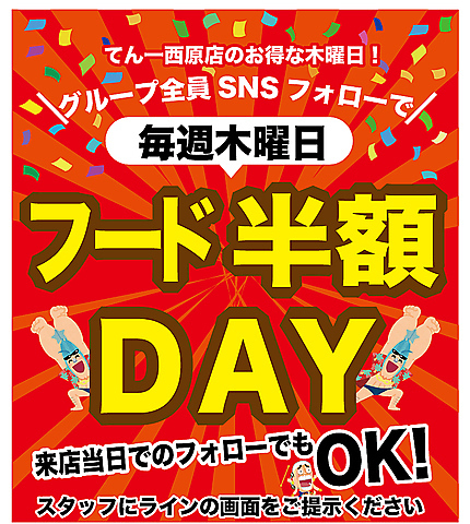 早い時間がお得のタイムサービスや、毎週木曜日限定のフード半額DAYなど様々なキャンペーンを実施しております!SNSフォローか友達追加でお得な割引サービスをご利用いただけます◎来店当日のフォローでもOKなのも嬉しいポイント♪詳細はクーポンページをご確認下さい。