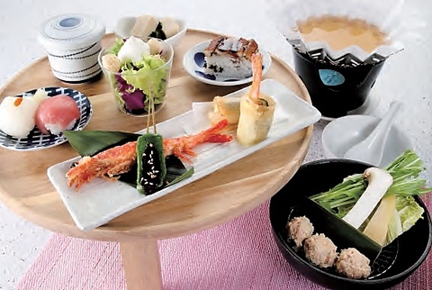 煮物、ソフトシェルシュリンプ串、よもぎ麩田楽、エビ春巻、サラダ、茶碗蒸し、手毬寿司、穴子押し寿司、鶏つくね鍋