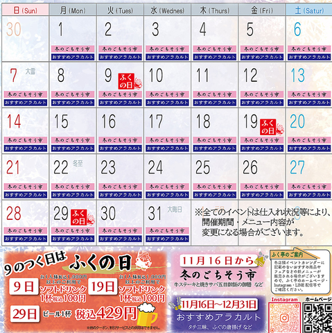 ふく(9)の日としまして、毎月9日、19日、29日の3日間デザートのサービスであったり、次回ご利用いただけるサービス券の配布をしていたり、、!内容は時期ごとに変更しますので、お楽しみに!