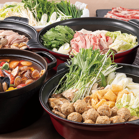 メインディッシュは目の前で湯気とともに仕上がる国産牛・国産豚のしゃぶしゃぶ。そのほか、すき焼き、豆乳鍋、チゲ鍋、おでんといった多彩な鍋料理をご用意。香り豊かな出汁と厳選した食材が織りなす味わいを、心ゆくまでお楽しみいただけます。