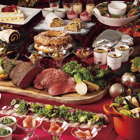 じっくりと焼き上げたやわらかな「国産牛のローストビーフ」をメインに「豚肉のロースト 香味味噌ソース」や「若鶏もも肉のブランケット」などの肉料理に加え、「サーモンのパイ包み焼き 白ワインソース」や「魚介のブイヤベース風」などの魚料理が並びます。