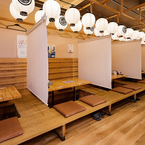 【〈掘りごたつ半個室4名様×6卓〉ゆったりお食事を◎】ゆっくりとお楽しみいただきたく、脚を伸ばして座れる掘りごたつ席をご用意しました。仕切りがあるので個室風にご利用いただけます◎4名様テーブルを6つ。24名様以上なら最大34名様で貸切もOK。打ち上げ、同窓会、結婚や誕生日など各種お祝いにぜひ。