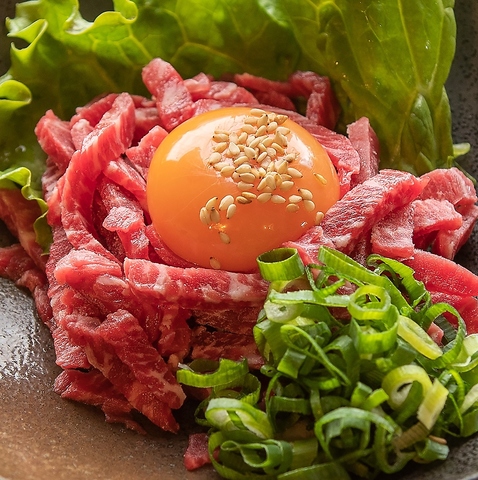 安心の熊本産馬肉をつかったユッケ。鮮度の良い馬肉に、自家製醤油ダレと濃厚焙煎胡麻油・卵黄をからめて召し上がれ。