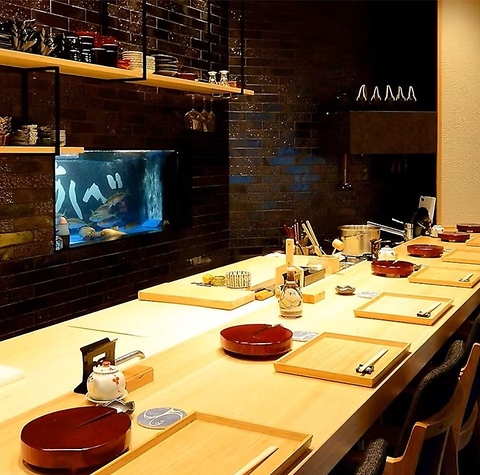 【1F:カウンター席】記念日のお祝い等の大切なお席に当店をご利用の際には、1Fのカウンター席にご案内致します。落ち着いた雰囲気の空間に設けられたカウンター席は、調理場が見えるライブ感のあるお席となっております。※画像はイメージです