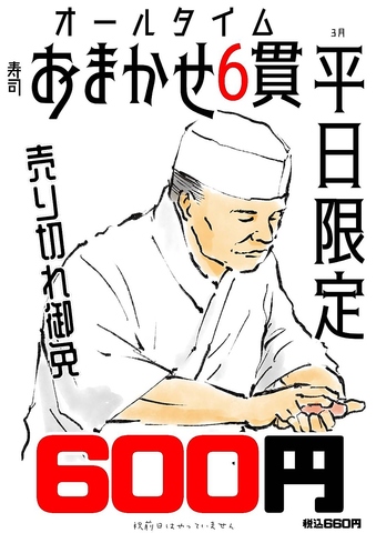 3月の平日限定キャンペーン開催中♪おまかせ6貫がオールタイム660円◎売切御免!! ※日~木曜限定・祝前不可