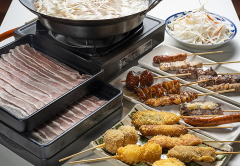 120分飲み放題付きプラン。炭火焼鳥・やきとん、人気の定番居酒屋メニュー、さらに、厳選したぷりぷり牛ホルモンのにら豚もつ鍋が食べ放題!驚愕コスパの食べ飲み放題コースです。串焼きは炭火で炙る本格派!揚げたての串カツも楽しめます。