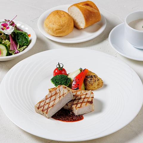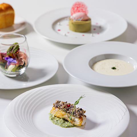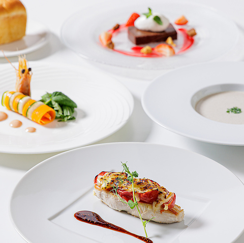 月替りで旬の食材を使用したメニューをお届けしております。メイン料理をお魚料理、お肉料理のどちらかをお選びいただくコースとなっております。フルコースでのご注文も可能でございます。