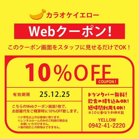 クーポン画面1枚で、お部屋代をご精算時に10%OFFいたします。※小学生以上のお客様に限ります。