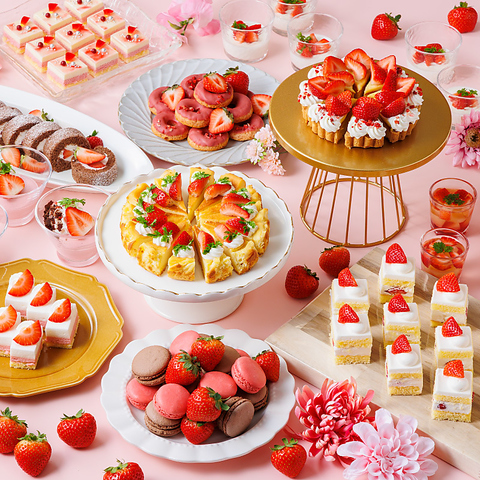 苺が主役の、甘くときめく世界観のスイーツビュッフェ!みずみずしい苺を贅沢に使用したスイーツの数々がビュッフェ台を華やかに彩ります。