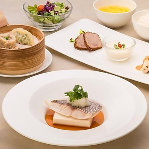 ふっくらと仕上げた鯛に桜島大根をのせ、坂元のくろずのまろやかな酸味を活かした醤油ベースの特製ソースで仕上げました。【セットメニュー】食前酢、前菜3種盛り合わせ、点心2種、サラダ、白飯、本日のスープ※点心なしは1,650円(税込)