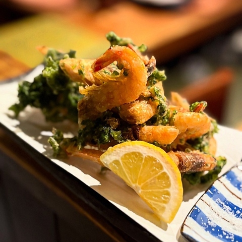 香り豊かなあおさと芝海老をかき揚げにしました。サクッとした食感にお好みでレモンを搾って。680円(税込)
