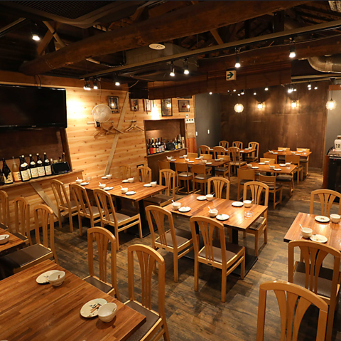 店内に入ると広々とした開放的な空間が広がります。アンティーク調の家具やおしゃれなインテリアが並び、まるで中華バルにいるかのような非日常感を味わえます。デートや女子会にもおすすめな、おしゃれで洗練された雰囲気です。【中華/なんば/難波/千日前/居酒屋/飲み放題/貸切/個室/宴会/団体/和牛/火鍋】