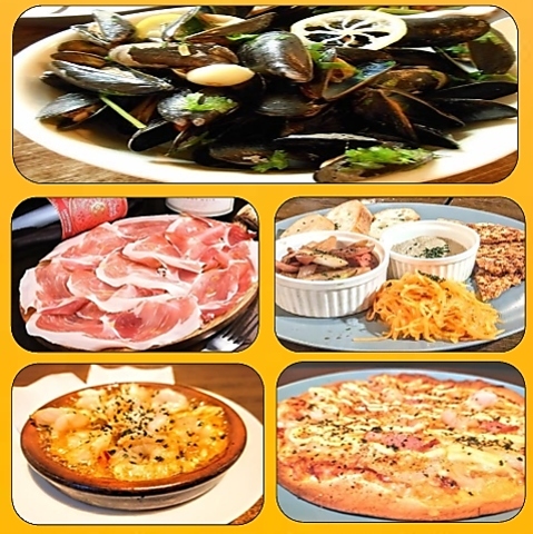 当店人気メニューのスペイン産生ハム『ハモンセラーノ』とエビのアヒージョにムール貝も付いてお酒も進む事間違いなしです!!飲み放題は生ビールとスパークリングワインはもちろん、自家製レモンサワーや自家製サングリアも入って40種で3時間なのでゆったり飲めます☆