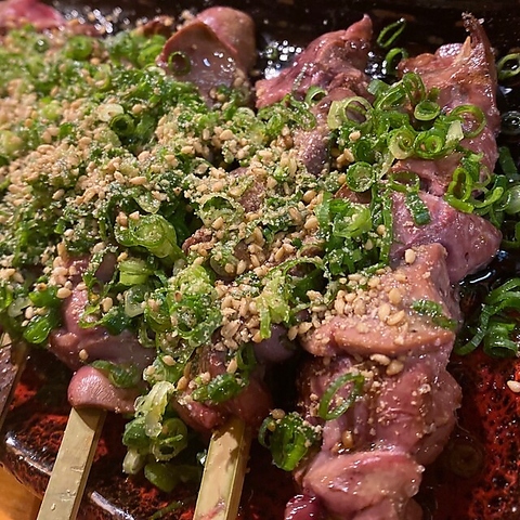 朝引き地鶏の肝をサッと炙り、ネギとゴマ油をかけた大人気メニューです!