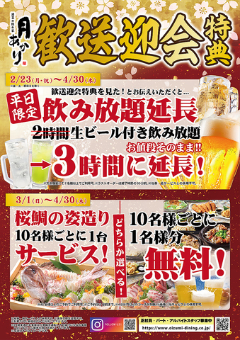 歓送迎会特典〈其の壱〉歓送迎会特典を見た!とお伝えいただくと[平日限定]2時間生ビール付き飲み放題→お値段そのまま3時間に延長!※完全個室にて2名様以上でご利用いただけます。〈其の弐〉どちらか選べる!桜鯛の姿造り10名ごとに1台サービスor10名様ごとに1名分無料!※他券・他サービスとの併用は不可となります。