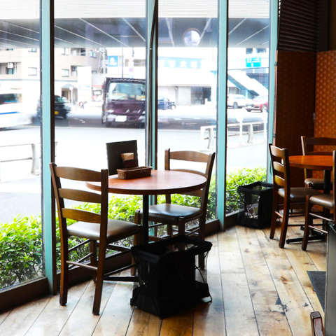 ガラス窓から明るい陽光が差し込む2名テーブル席