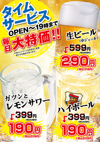 オープンから19時まで、毎日生ビール290円・ハイボール190円♪何杯飲んでもこの価格。早い時間がお得です☆