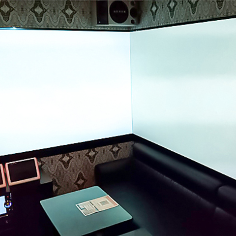 迫力満点の二面プロジェクタールームになります。本人出演などの映像重視の方はぜひこちらのルームをご体験ください。こちらのお部屋は人気が高いため、店舗までお電話にてご予約くださいますようお願い申し上げます。ご予約の際は、「デュアルモニタールーム希望」をお申し付けください。