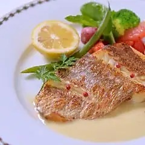 サワラの下蒜山米と地魚のソースをしいた一皿。ミキュイ(半生)仕上げた魚の触感と過熱した白身魚が複雑な旨味を実現しました。