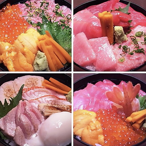 平日、土日祝日ともにお得なランチ限定メニューをご用意しております。メニュー内にある各種海鮮丼は大ぶりで厚切りの新鮮なネタが贅沢に乗った美味しそうなものばかり。それらを、本来であれば絶対にお出しできない破格の値段でご提供しております。単品、またはセット(茶碗蒸し・サラダ・味噌汁付き)でお楽しみ下さい。
