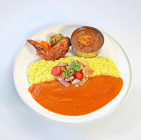 ヒナタ屋の代表的なカレーの種類を、それぞれハーフサイズで一度に味わえます。手羽先焼きチキンもついた満足プレート!