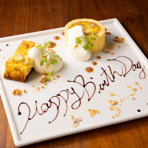 大切な記念日をメッセージ付きプレートでお祝いいたします。お電話にてご相談を承ります。