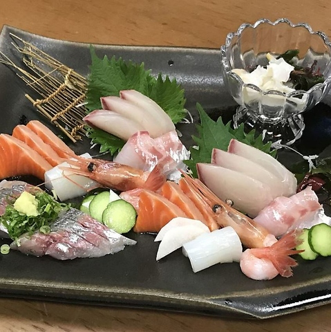 ブリ、鯛、サーモン、赤イカ、サワラ、梅貝、甘エビ、アジなど日本海の秋の旬 お造り盛り合わせ ※仕入れの状況により内容が変更になる場合も御座いますのでご了承ください。 ※写真はイメージです。