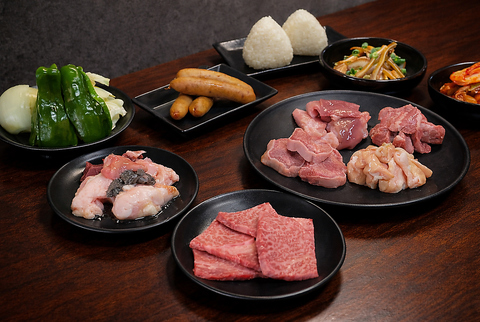 税込5500円(2人前/お一人様2750円) 博多和牛カルビ、国産豚ホルモン4種、牛ミックスホルモンに加え、ウインナー・焼き野菜・おつまみ2品・焼きおにぎり付き。新鮮ホルモンをしっかり楽しめる満足度の高いセットです。※2名様から人数分でご注文いただけます。