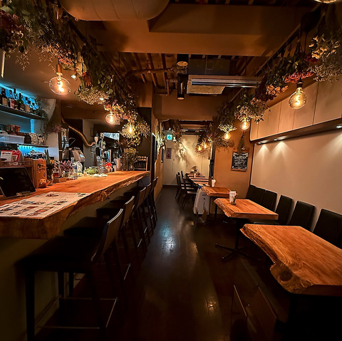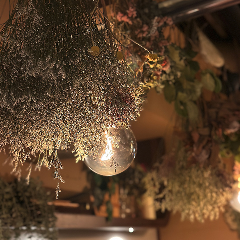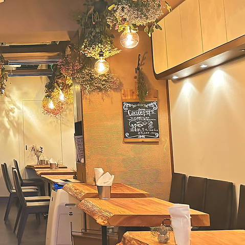 木の温もりとドライフラワーに囲まれたボタニカルな店内で身体に優しい無添加の燻製料理を!