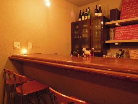 カウンター席で1人でも気軽に楽しめる。オレンジ色のやわらかな灯りが、優しく出迎えてくれる。