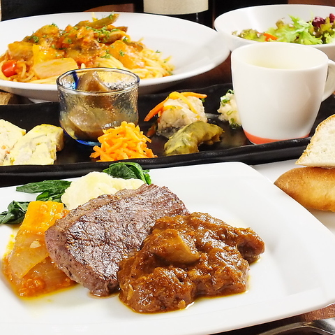 前菜、サラダ、ハーフパスタ、パン、ハーフメイン料理、プチデザートが食べられるお得なセット。贅沢な気分でランチを楽しめる。