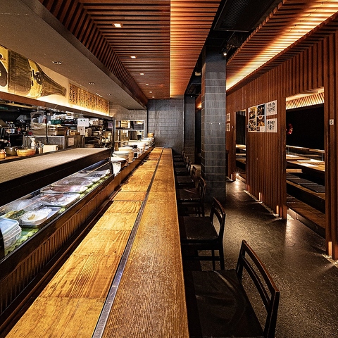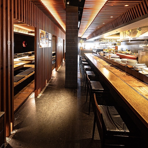 カウンター席は目の前が調理場で臨場感が抜群。席の間隔も広いので落ち着いてお召し上がりいただけます。