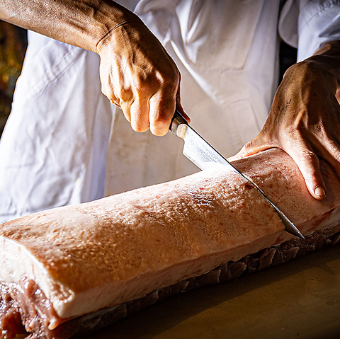 鹿児島県産の黒豚を熟成。一頭買いだからこそできる量り売りスタイル。200~400gで選択可能