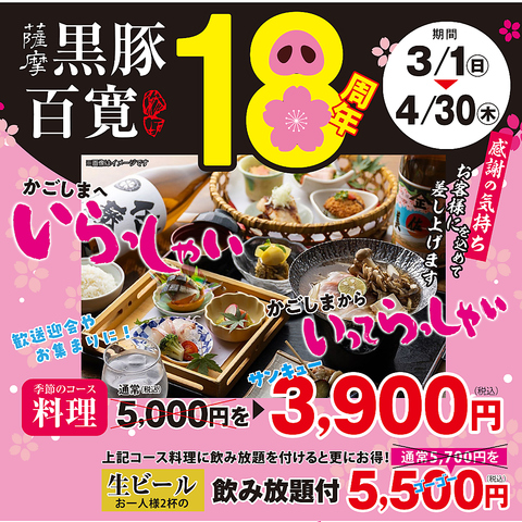 【3月1日~4月30日】まで開催中!豪華コースが今だけ3,900円【チラシ持参で】生ビール1杯390円など