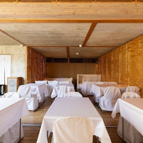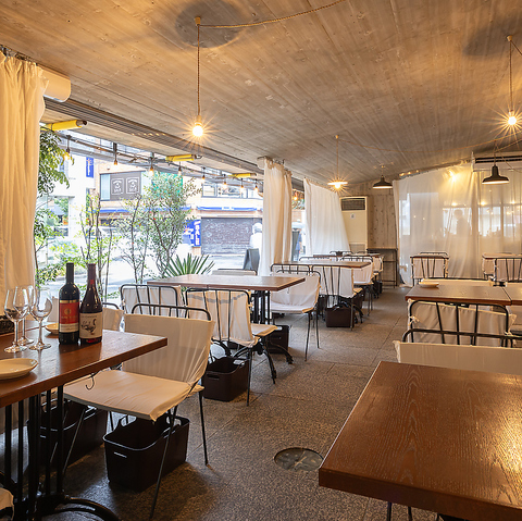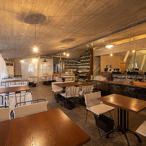 カジュアルながらもスタイリッシュな空間。あたたかい季節はオープンエアの開放感の中で、ビール、スパークリング、キリッと冷えた白ワインを楽しむのもオススメです。