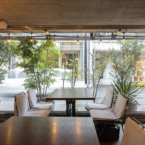 【1Fテーブル席】壁一面を開放した明るく開放感のあるオープンテラス席。白を基調とした木の温もりある店内で過ごすひとときは、思わず広島の中心部にいることを忘れてしまう程。ちょっとした非日常を味わえる自慢のフロアです。