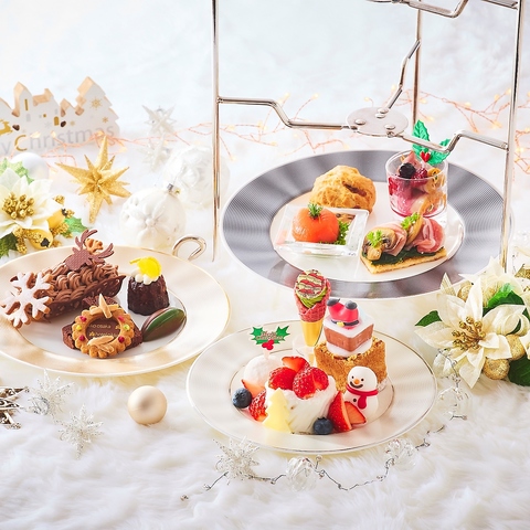マロンが隠れたチョコレートモンブランのソリやバナナカスタードシュークリームの煙突にサンタの足が!! クリスマスの物語がはじまる楽しいスイーツが勢ぞろい。