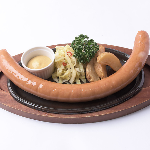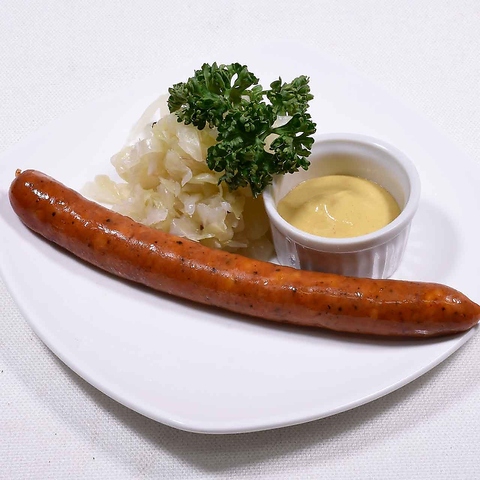 パリっとジューシー♪だん家オリジナルの「だん家ソーセージ」!大きいソーセージは食べ応えあり◎付け合わせのザワークラウトは自家製です。みなさまでシェアしてお召し上がり頂けます。注文必須の逸品です☆