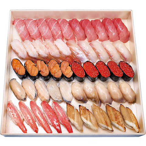 本まぐろ中とろ、ぼたん海老、天然まぐろ赤身、本日の厳選白身、いか、本ずわいがに、活あわび、生うに軍艦、いくら軍艦、穴子、 ※商品内容の変更は出来ませんので予めご了承ください。