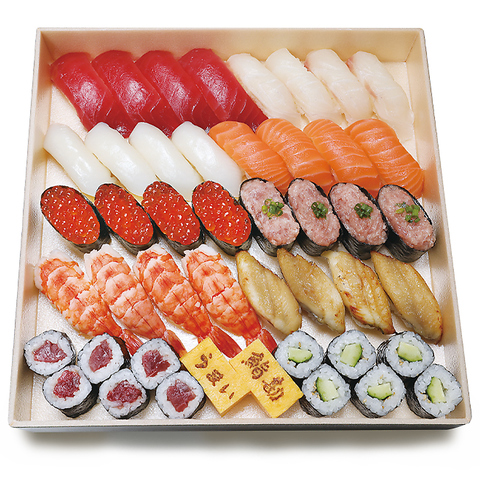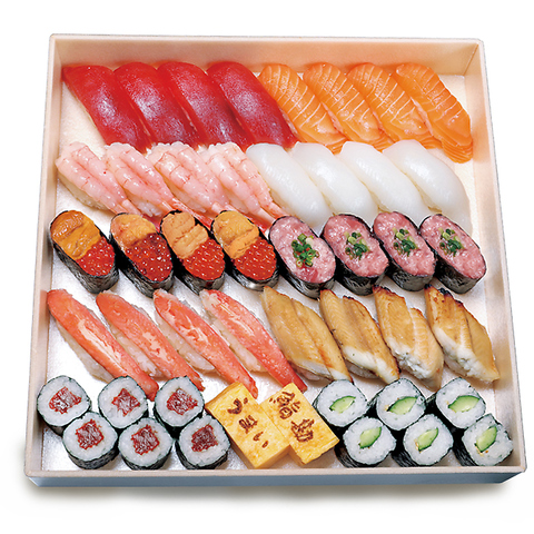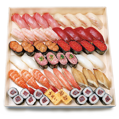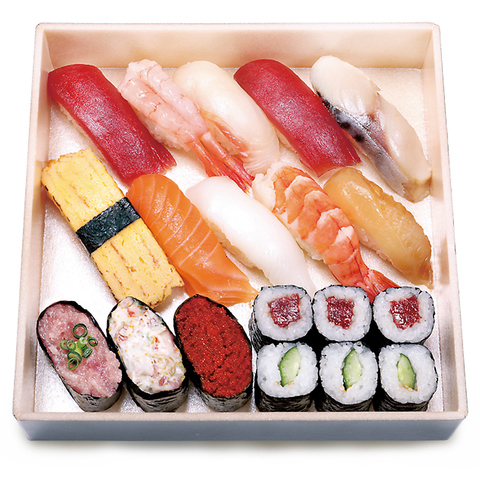 天然まぐろ赤身、いか、蒸し海老、生サーモン、いくら軍艦、たまご握り、鉄火細巻、かっぱ細巻、おしんこ細巻、梅じそ細巻、 ※商品内容の変更は出来ませんので予めご了承ください。