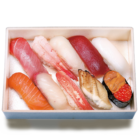 本まぐろ中とろ、本日の厳選白身、甘海老、天然まぐろ赤身、生うに軍艦、いくら軍艦、いか、ねぎとろ軍艦、蒸し海老、本ずわいがに、穴子、鉄火細巻、厚焼たまご ※商品内容の変更は出来ませんので予めご了承ください。