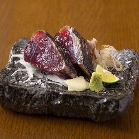 『鹿児島一本釣りかつお』身がしまった鮮度抜群の鰹は炙った皮の香ばしさと脂の旨味鮮やかな赤身のもちもちとした食感をお楽しみください。数量限定