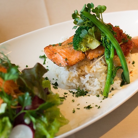 オープン当初から作り続けている名物料理!良質なサーモンを香ばしく焼いて白ワインでフランベ。バター、醤油、ご飯の組み合わせでどうそ!