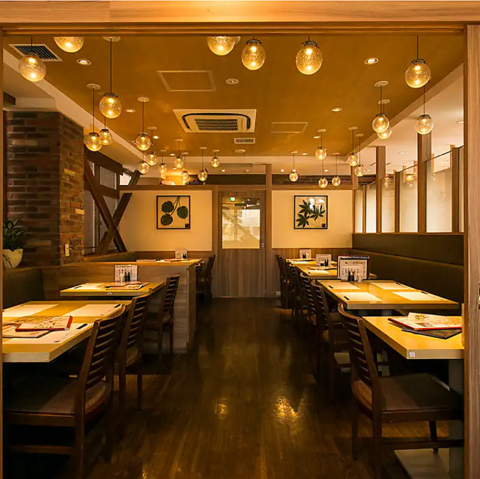 明るくスタイリッシュな雰囲気の店内。片面ソファーになっている4名様掛けテーブル席が4卓並んでおり、12名様~16名様で完全個室として利用可。ゆとりのある空間で、ごゆっくりとお寛ぎいただけます。大きな窓が開放感たっぷり◎