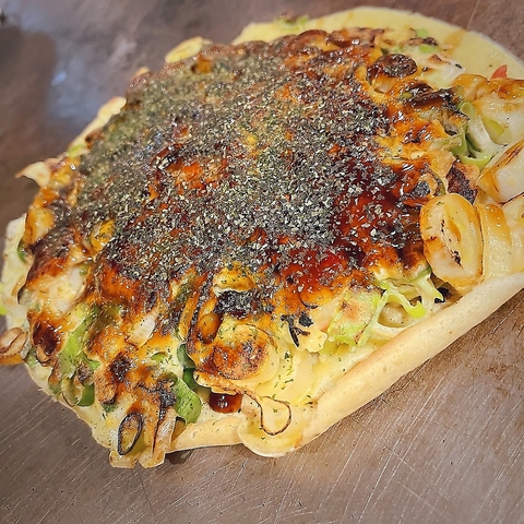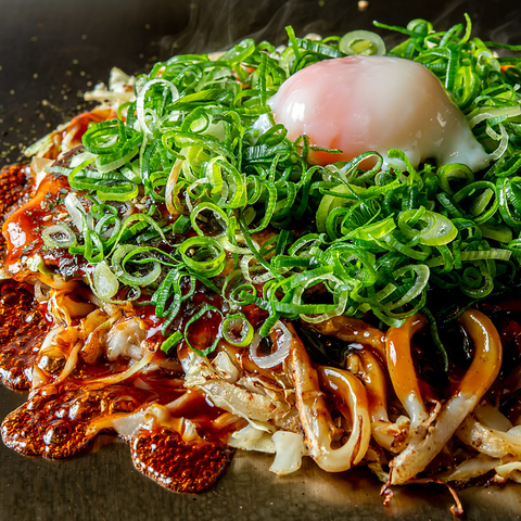 当店イチオシ!広島お好み焼き 前田智徳スペシャル!中央に卵を乗せてアツアツのお好み焼きをご賞味ください♪そしてたっぷりのねぎは九条ねぎを使用。広島お好み焼きに適していると言われ、香りも風味も良く、ねぎ特有の臭みがありません。